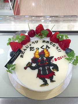 過去に作成したプリントケーキの作成実績となります。「写真をプリントしたい」、「イラストをプリントしたい」などイメージをスタッフまでお伝えください。簡単な合成もできますので、お気軽にご相談ください。